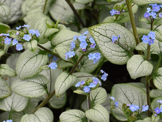 Бруннера крупнолистная "Alexandria" – изысканный декоративнолистный многолетник с эффектной серебристой листвой, который станет настоящим спасением для тенистых уголков сада, идеально подходя для оформления миксбордеров, бордюров у водоемов, приствольных кругов деревьев, рокариев или выращивания в контейнерах на террасах. Этот сорт выделяется крупными сердцевидными листьями с серебристо-белым оттенком и контрастными зелеными прожилками, создающими призрачный, почти иридисцентный эффект, а также нежными голубыми цветками, напоминающими незабудки.Растение формирует плотную, куртинную розетку высотой 30–50 см и шириной 50–60 см. Корневища поверхностные, рост умеренный, без агрессивного расползания, что позволяет легко контролировать площадь.
