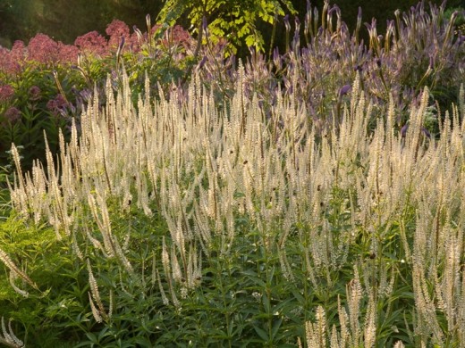 Цветки мелкие, трубчатые, чисто-белые, собраны в длинные (до 20–30 см) вертикальные колосовидные соцветия, напоминающие свечи. Цветение обильное, приходится на июнь–август (иногда до сентября).
