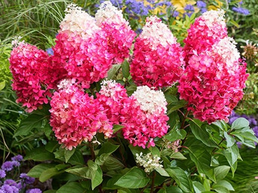 Главная отличительная черта крупные, плотные пирамидальные соцветия. Их окраска меняется в течение сезона: в начале цветения (в июле) они кремово-белые, затем становятся чисто белыми, а к августу начинают постепенно приобретать розовый оттенок, который к сентябрю переходит в насыщенный винно-красный, бархатистый "красный бархат", сохраняющийся до октября. Цветение обильное и продолжительное.