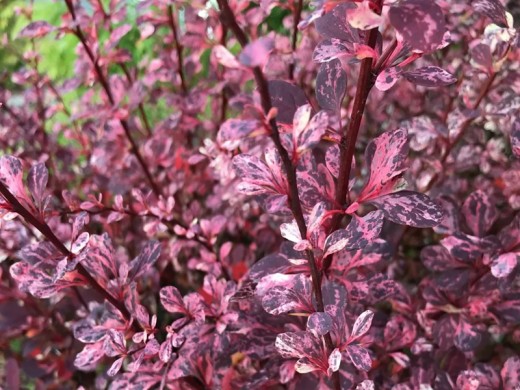 Барбарис Тунберга "Rose Glow" потрясающе декоративный листопадный кустарник с уникальной пестрой листвой, который станет настоящей изюминкой сада, идеально подходя для создания ярких бордюров, живых изгородей, акцентов в миксбордерах, альпинариях или одиночной посадки в контейнерах на террасах. Этот сорт поражает своей изменчивой, почти акварельной окраской листьев, сочетая глубокий пурпур с нежными розовыми и белыми мазками.Растение формирует плотный, округлый или слегка раскидистый куст высотой 1,2-1,5 м и шириной 1,2-1,8 м. Побеги прямые или слегка дугообразные, густо усыпаны острыми шипами, что делает его отличным естественным барьером.