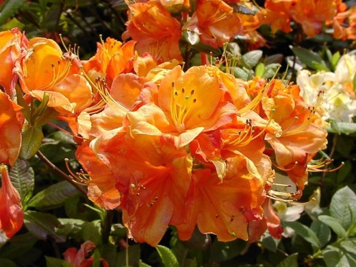 Листья овальные, длиной 5–7 см, летом зеленые с легким глянцем, а осенью переходящие в яркие оттенки красного, оранжевого и желтого, что добавляет растению декоративности в конце сезона. Цветки трубчатые, диаметром до 6 см, ярко-оранжевые с золотистым отливом, собраны в шаровидные соцветия по 8 штук. Цветение обильное, приходится на конец мая – начало июня, сопровождается насыщенным ароматом и привлекает бабочек.