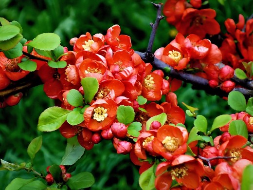 Зацветает в мае, еще до распускания листьев. Цветы ярко-оранжевые или красные, медоносные, собраны в соцветия по 2-6 штук, до 3 см. в диаметре. Съедобные плоды созревают в сентябре.
