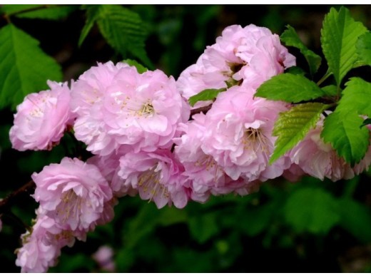 Кустарник высотой до 3 м, на родине до 5 м, с раскидистой кроной до 1,5 м в диаметре и темно-серыми побегами. Листья сверху желто-зеленые, снизу сероватые, осенняя окраска часто слабовыражена. Цветки розовые, темно-розовые, малиновые, махровые, до 3,5 см в диаметре, парные, густо расположены по всей длине прошлогодних побегов. Диаметр цветков 1,5-3 см. Цветет до распускания листьев в первой половине мая, в течение 2 недель. Цветки хорошо сохраняются в срезке. В суровые зимы у миндалей подмерзают цветочные почки и концы побегов. Если много снега, то возможно и выпревание корневой шейки. Иногда делают прищипывание сочных концов побегов, чтобы ослабить их рост и дать возможность одревеснеть, закончив своевременно рост. Это лучший способ подготовки растений к зиме.
