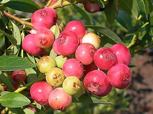 Голубика высокорослая "Pink Lemonade" – плодоносящий кустарник, выделяющийся необычной розовой окраской ягод.Куст достигает высоты 1.8 м и диаметра около 1,2 м, с компактной, густой кроной. Побеги прямостоячие, листья ланцетные, ярко-зеленые, осенью приобретают оранжево-красные оттенки.