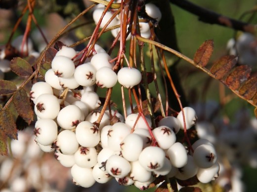 Рябина белая "Кашмирская" особенно декоративна во время плодоношения. Подходит для одиночной и групповой посадки.Дерево или кустарник высотой до 4–6 м, с ажурной раскидистой кроной. Кора гладкая, серая или красновато-серая. Листья очерёдные, сложные, непарноперистые, длиной 15–23 см, сверху тёмно-зелёные, снизу светло-зелёные, осенью желтеют.