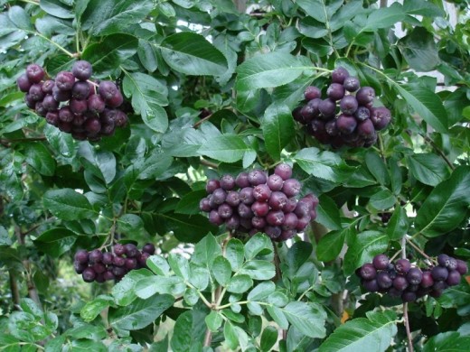 Плоды крупные, до 1,5 г, чёрного цвета, собраны в грозди, обладают лечебными свойствами. Созревают в сентябре.