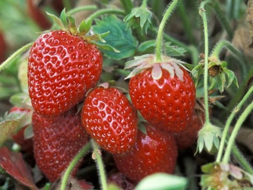 Листья тройчатые, темно-зеленые, блестящие, формируют плотную розетку, устойчивую к жаре и болезням. Цветки среднего размера, белые, диаметром 2–3 см, появляются волнами на крепких цветоносах. Ягоды крупные, 50 г. , ярко-красные, блестящие, с насыщенным сладким вкусом и тонким ароматом, сохраняют качество до конца сезона.
