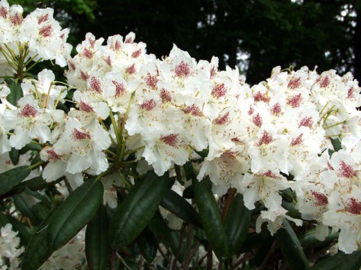 Рододендрон гибридный "P.M.A. Tigerstedt" -сорт финской селекции, поразительной красоты вечнозеленый кустарник с белыми цветками, великолепно выглядит в групповой посадке или отдельно стоящим кустом, прекрасный компаньон для хвойных растений.К 10-ти годам кустарник вырастает высотой и шириной до 1,5- 2 м. В плотной тени крона разваливается, теряет форму. Листья плотные, темно-зеленой окраски, овально- вытянутой формы до 15 см. Растет медленно, годовой прирост около 10 см.