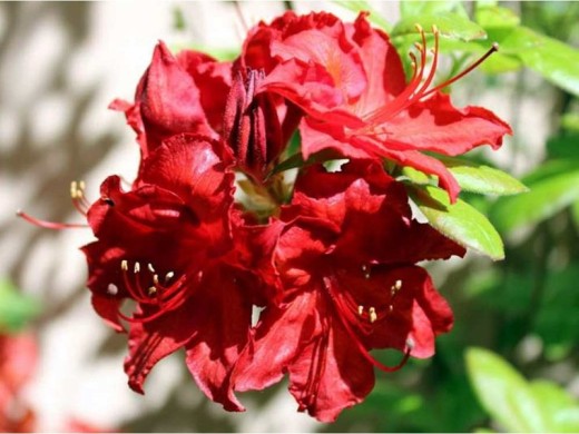 Цветение наступает в середине июня, и длится 3 недели. Цветки распускаются почти одновременно с листвой. Окрас цветков насыщенно тёмно-красный со светло-красным пятном на верхнем лепестке, не выгорает на солнце. Цветки диаметром 6,5 см, с длинными тычинками, выступающими за пределы цветка. Соцветия плоские, состоят из 7-10 цветков.
