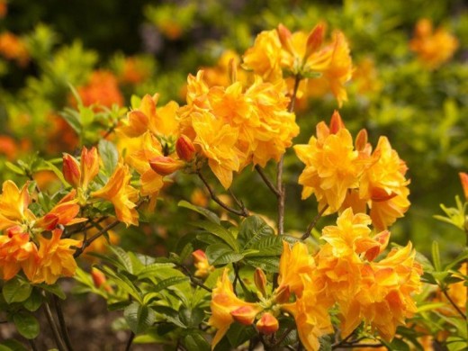 Рододендрон листопадный (азалия) "Csardas" - роскошно цветущий сорт с яркими цветками янтарного цвета. Привлекательно выглядит в групповой посадке или отдельно стоящим кустом, прекрасный компаньон для хвойных растений.Куст достигает к 10-ти годам высоты 90-110 см и ширины 150 см. Побеги прямые, создают округлую крону, годовой прирост до 10 см. Лиственный покров зелёный, молодые листья с бронзовым отливом. Корневая система поверхностная.