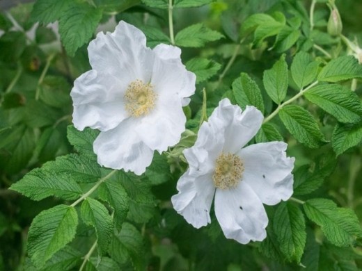 "Alba" прекрасный кустарник с белыми цветками, который можно использовать для создания живой изгороди, так же имеет съедобные плоды.Высота и ширина куста достигает около 1.5 м.
