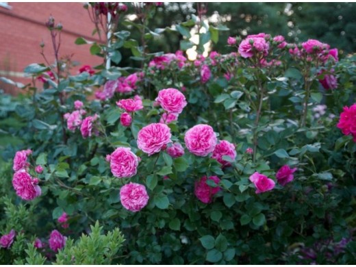 Цветки окрашены в различные тонна розового цвета - от светлого до насыщенно-темного. Розетковидные розы достигают в диаметре около 7 см Сорт махровый