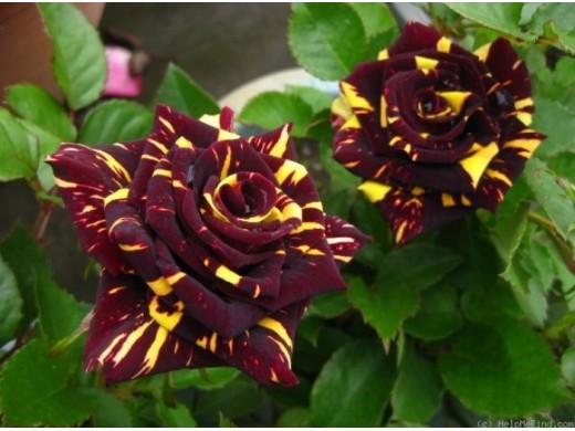 Цветки чашевидной формы Эти розы среднего размера, около 5-7 см в диаметре. Цветки состоят из 3-4 десятков ярко окрашенных лепестков, махрового типа. Лепестки темно-красные с неравномерными широкими желтыми или темно-кремовыми прожилками.