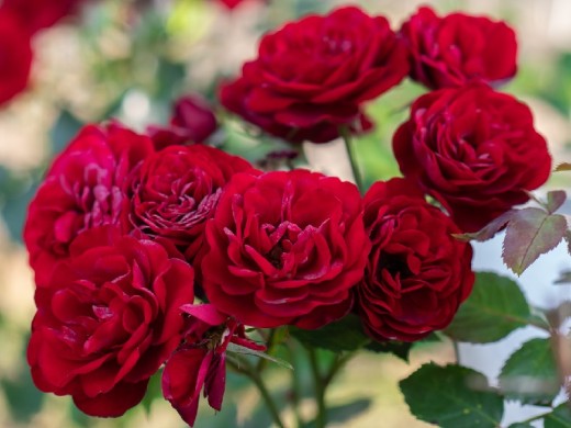 Розы имеют темно-красный окрас, при полном роспуске в центре показаны желтые тычинки. Чашевидные цветки имеют размер в диаметре до 5-7см Сорт махровый (около 40 лепестков)