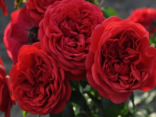 Розы окрашены в ярко-красный цвет Чашевидные цветки имеют размер в диаметре до 6 см Сорт густомахровый (около 55 лепестков)