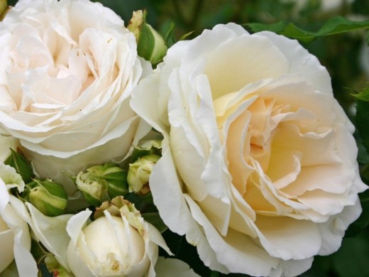 Цветки густомахровые (от 40 до 60 лепестков), диаметром 8–10 см, чашевидной или розетковидной ностальгической формы. Окрас изысканный: кремово-белые или чисто-белые лепестки, иногда с нежным абрикосовым оттенком в центре. Цветки могут располагаться по одному или в небольших соцветиях по 1-3 штуки. Аромат слабый.