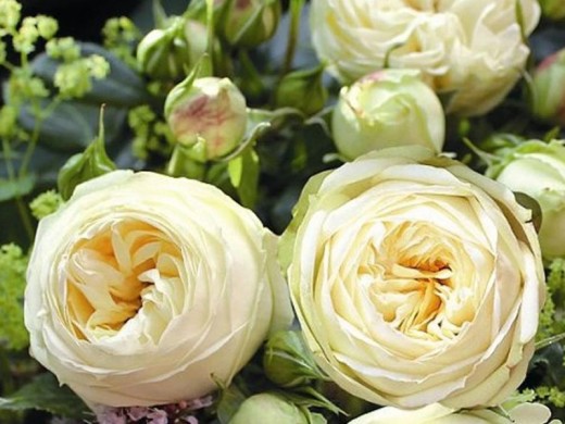 Цветение повторное, очень обильное волнами в течение всего сезона. Цветки густомахровые , диаметром 6–7 см, квартированной чашевидной формы. Окрас — кремово-белый, часто с нежным зеленоватым или сливочным оттенком в центре. Бутоны долго сохраняют идеальную шаровидную форму, медленно раскрываясь. Цветки собраны в небольшие соцветия. Аромат лёгкий.