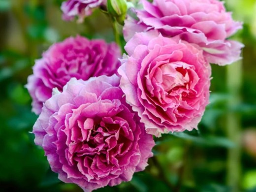Цветки окрашены в насыщенный розовый цвет с сиреневым оттенком. Чашевидные цветки имеют размер в диаметре до 12 см. Сорт густомахровый, лепестки как будто взъерошены, от чего цветки кажутся кружевными.