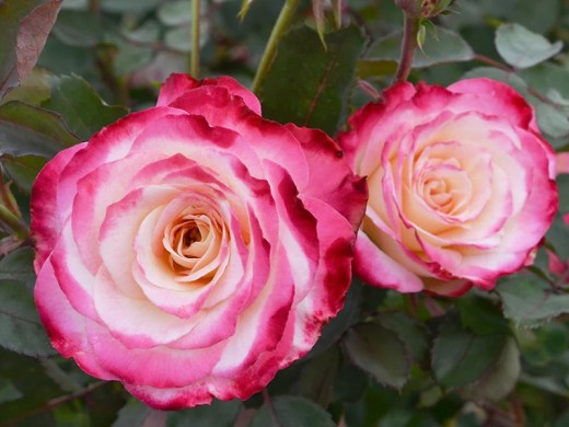 Острые, круглые, ярко-розовые бутоны раскрываются и выпускают нежные, чашевидные цветки диаметром 6 см. В них 50 лепестков с атласным покрытием. Сердцевина цветка имеет золотисто-зеленый цвет, а внешние лепестки обращены наружу. Эта особенность придает розе кокетливый вид и свежесть. Цветок имет два окраса: розово-кремовый с темно-розовой каймой.