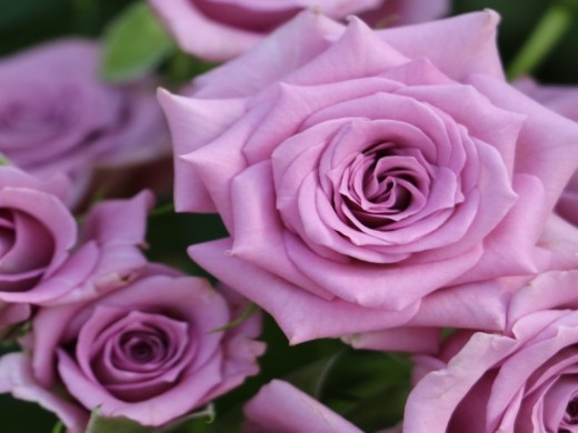 Розы окрашены в сиреневый цвет. Чашевидные цветки имеют размер в диаметре до 5 см. Сорт махровый ( около 25 лепестков)