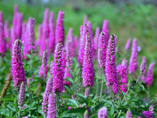 Колосовидные соцветия длиной 25см собраны из маленьких цветочков ярко сиренево-фиолетового цвета. Цветет очень обильно с июня месяца.