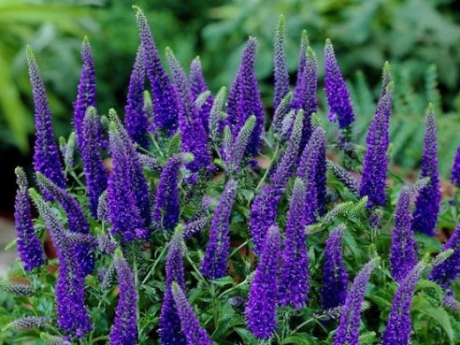 Цветы темно-синего цвета собраны в колоски высотой 15-20см. Цветет с середины июня до августа.