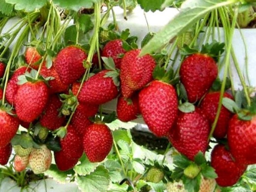 Листья тройчатые, темно-зеленые, блестящие, формируют плотную розетку, устойчивую к внешним условиям. Цветки среднего размера, белые, диаметром 2–3 см, появляются волнами на высоких многозачатковых цветоносах. Ягоды крупные, 45 г. , красные, блестящие, с превосходным сладким вкусом и тонким ягодным ароматом, сохраняют качество даже в дождливую погоду.